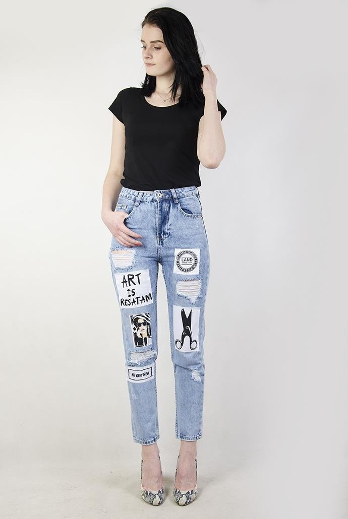 Spodnie jeansowe typu boyfriendy z naszywkami i dziurami