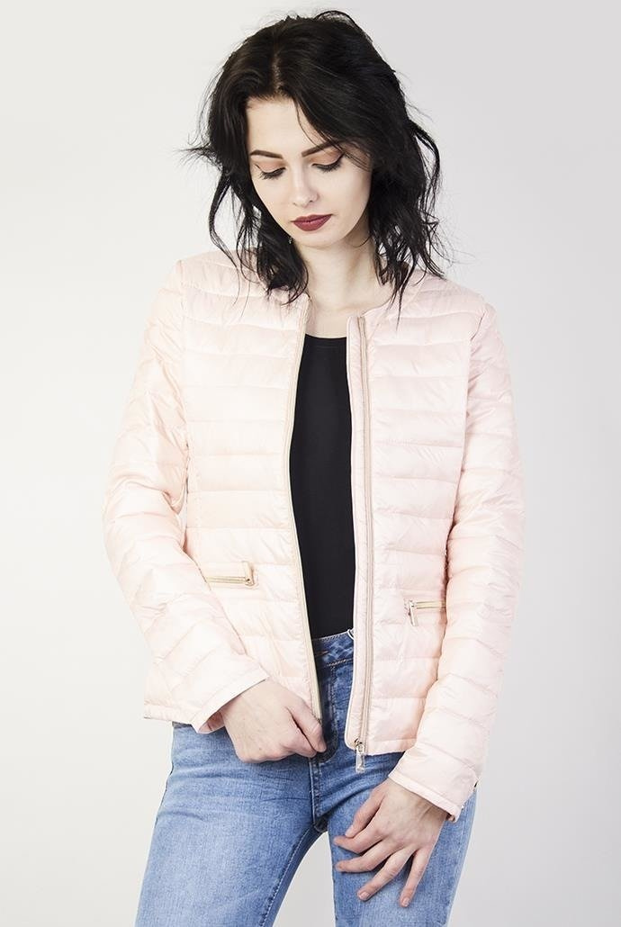 Jasnoróżowa kurtka pikowana z zamkami przy kieszeniach.
