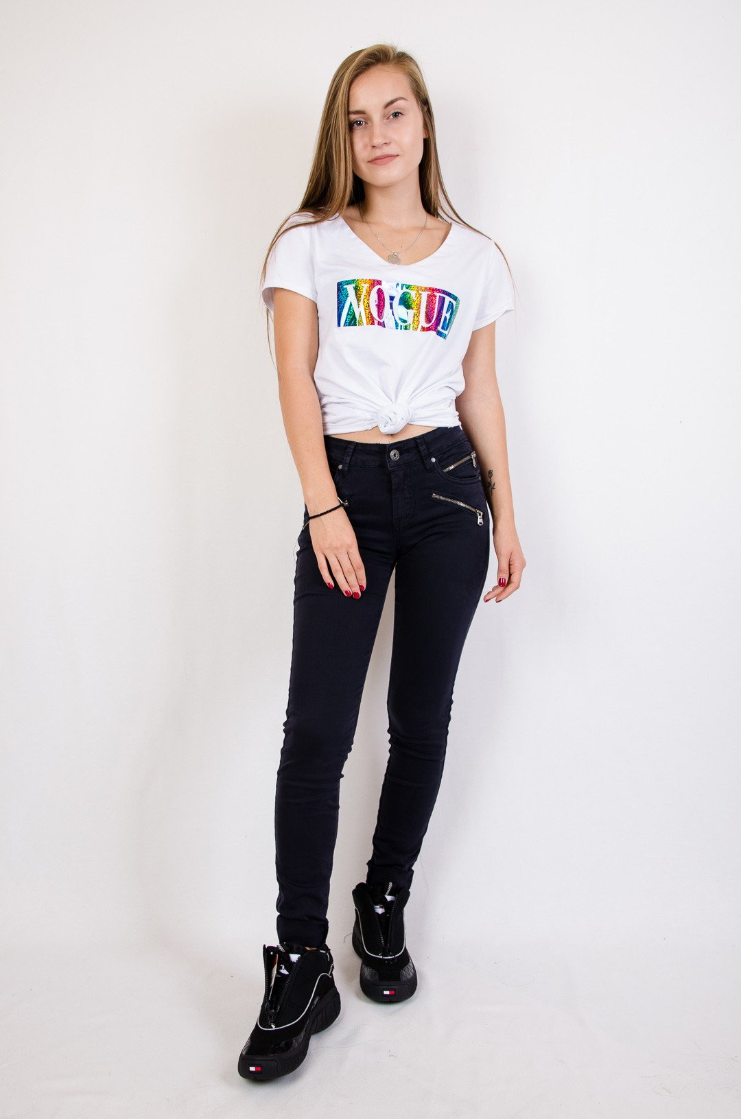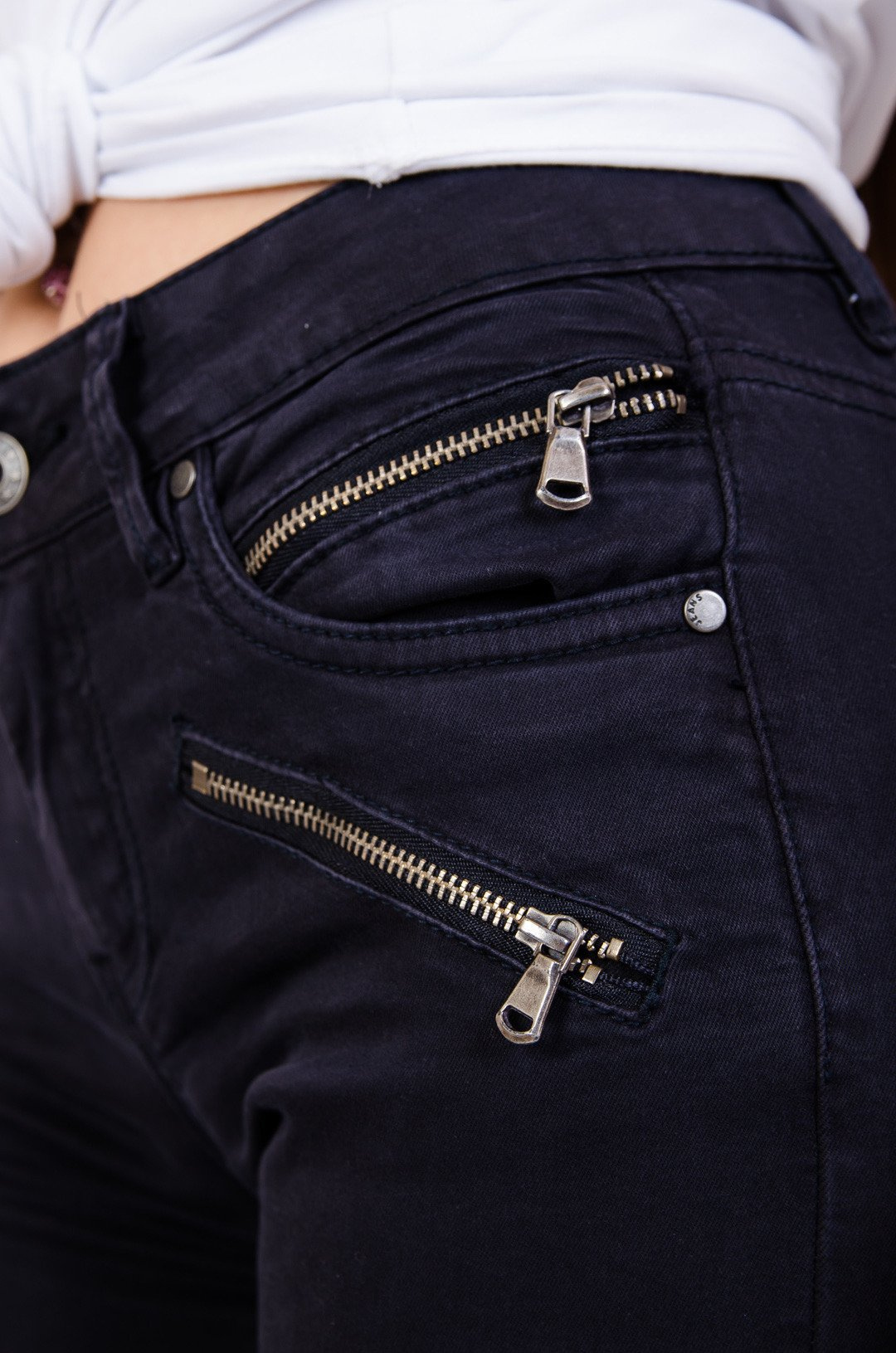 Granatowe spodnie rurki z zamkami przy kieszeniach.