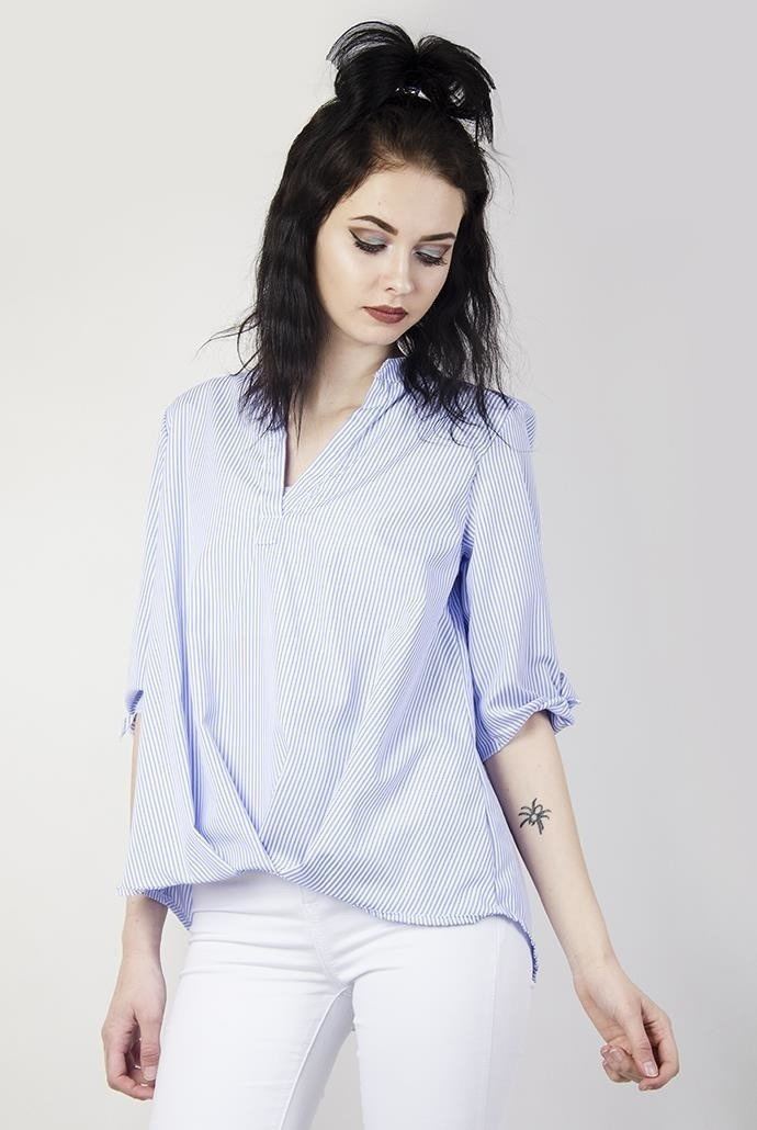 Asymetryczna koszula w paski, z wiązaniami przy rękawach i efektownym przeszyciem z przodu na dole.