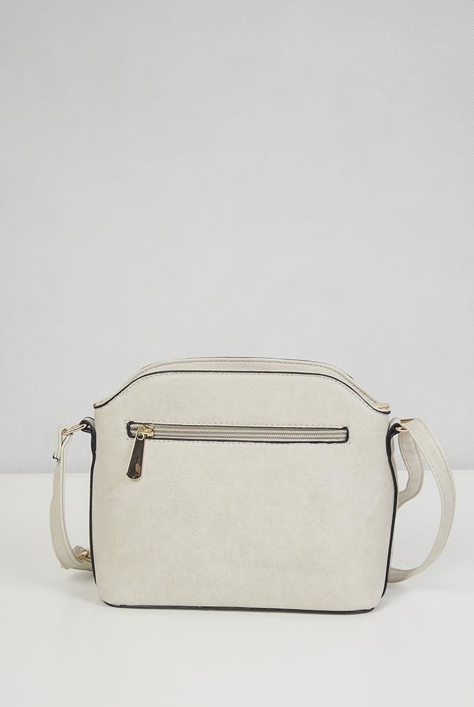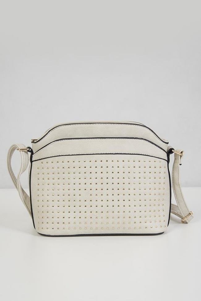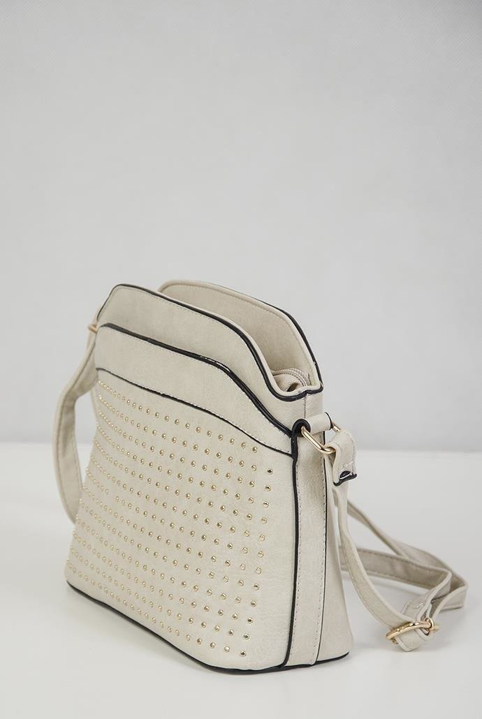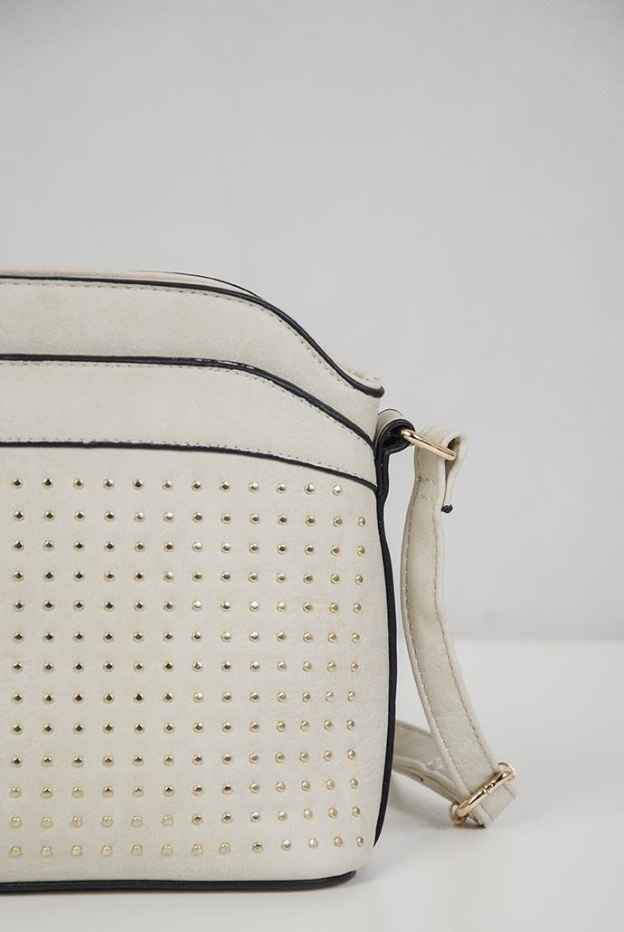 Kremowa, mała torebka zdobiona ćwiekami. W środku posiada kieszonki na klucze czy portfel.Torebka ma regulowany pasek.