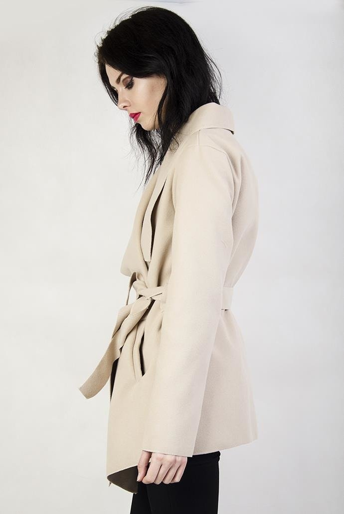 Beżowa narzuta typu płaszcz, wiązana w pasie.