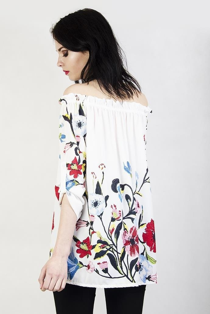 Biała bluzka w motyw kwiatowy, z hiszpańskim dekoltem.