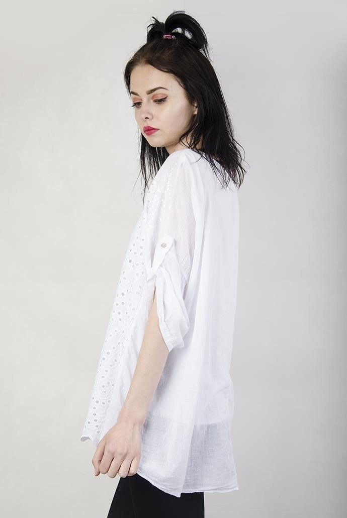 Biała bluzka z wyciętym wzorem, z cekinami przy ramionach.