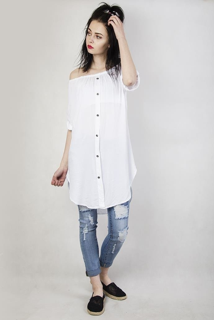 Biała przedłużana bluzka zapinana na guziki, z gumką w dekolcie