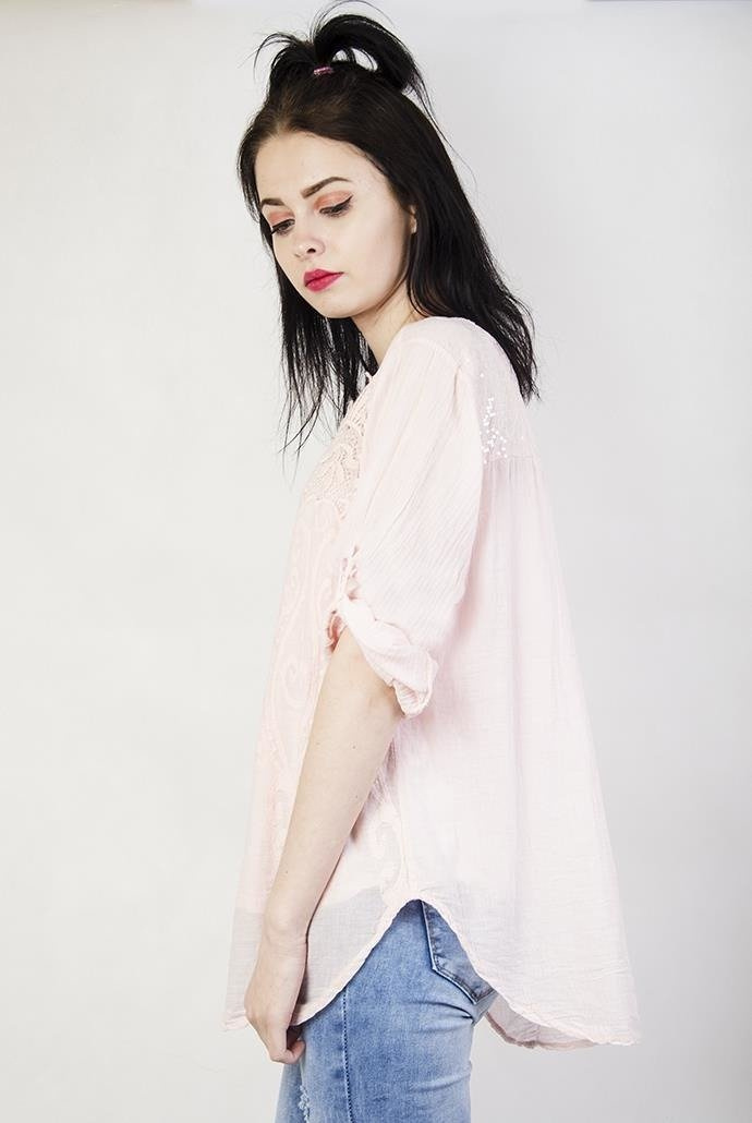 Jasnoróżowa bluzka koszulowa z ażurowym zdobieniem przy dekolcie.