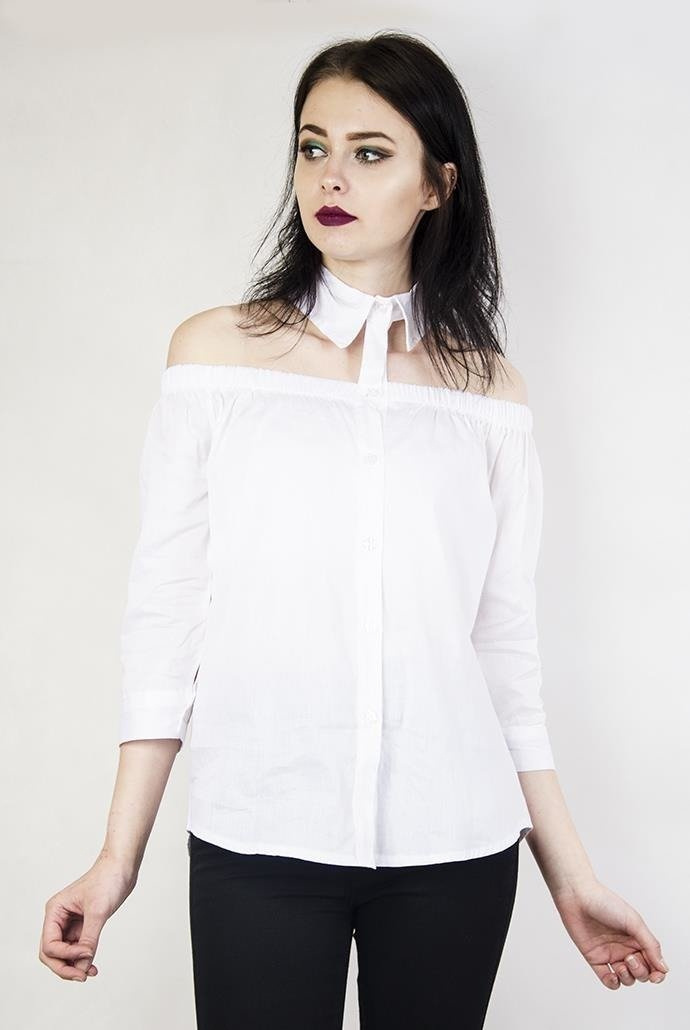Biała koszula z kołnierzykiem przy szyi. Posiada gumę w dekolcie.