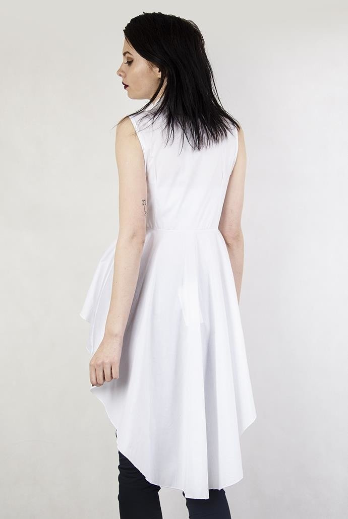 Biała koszula zapinana na guziki, z przedłużanym tyłem.