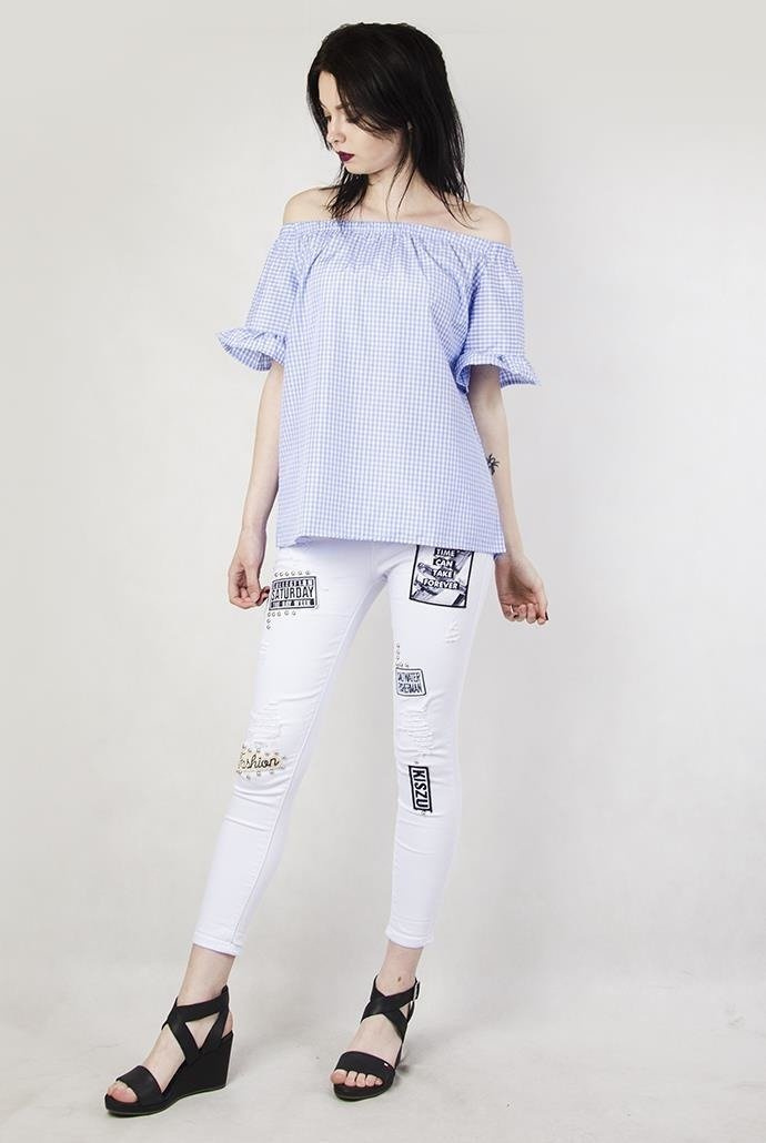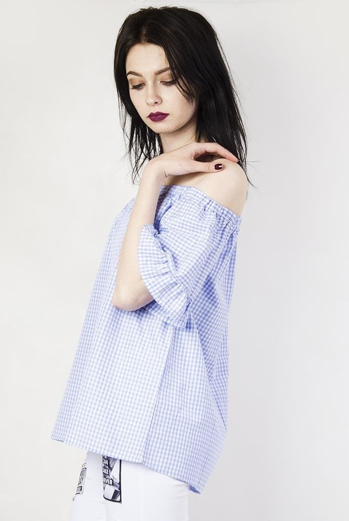 Jasnoniebieska koszula w kratę z szerokim dekoltem