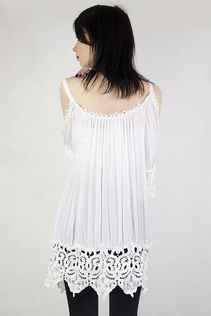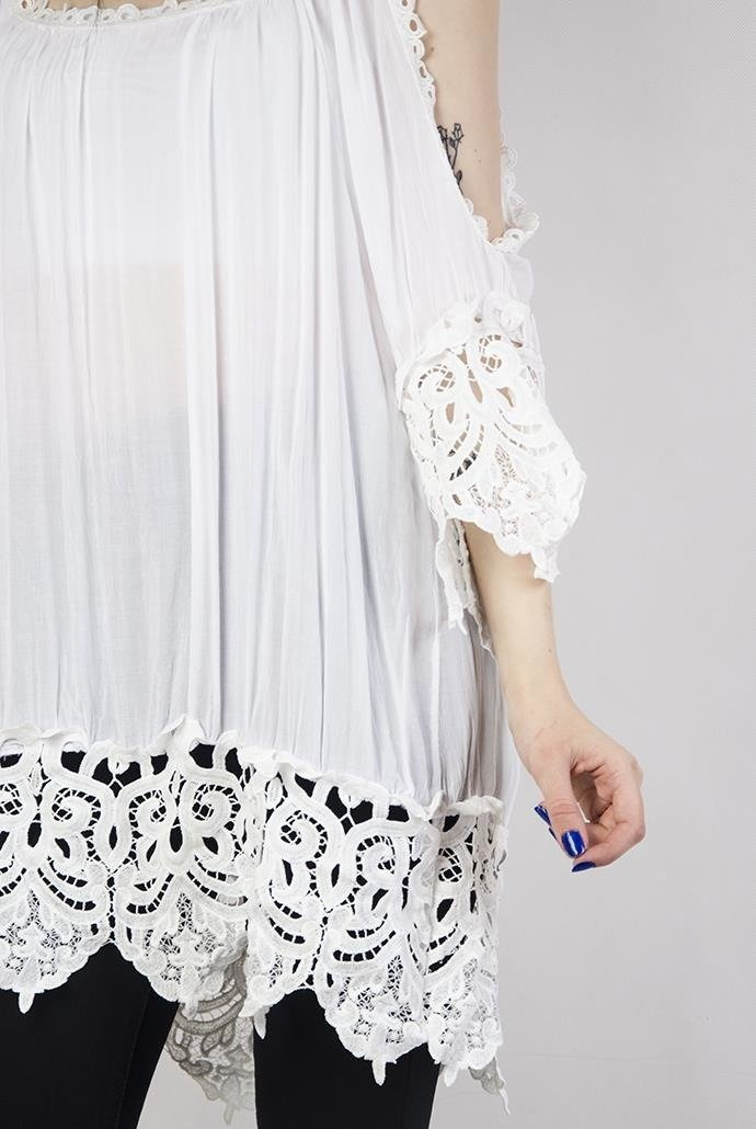 Biała bluzka z ażurowymi wstawkami i odkrytymi ramionami.