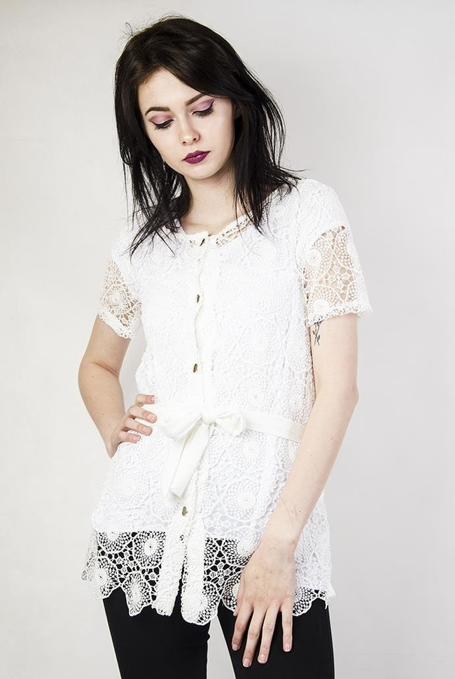 Biała ażurowa narzutka zapinana na guziki. Posiada wstążkę w pasie.