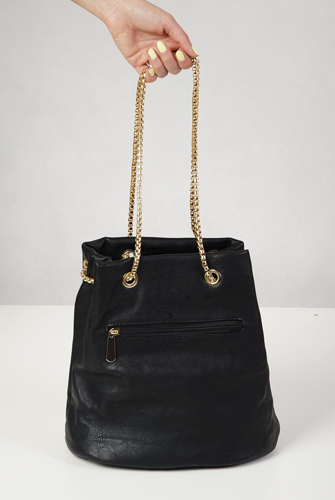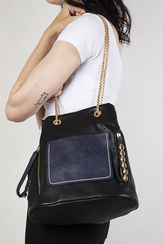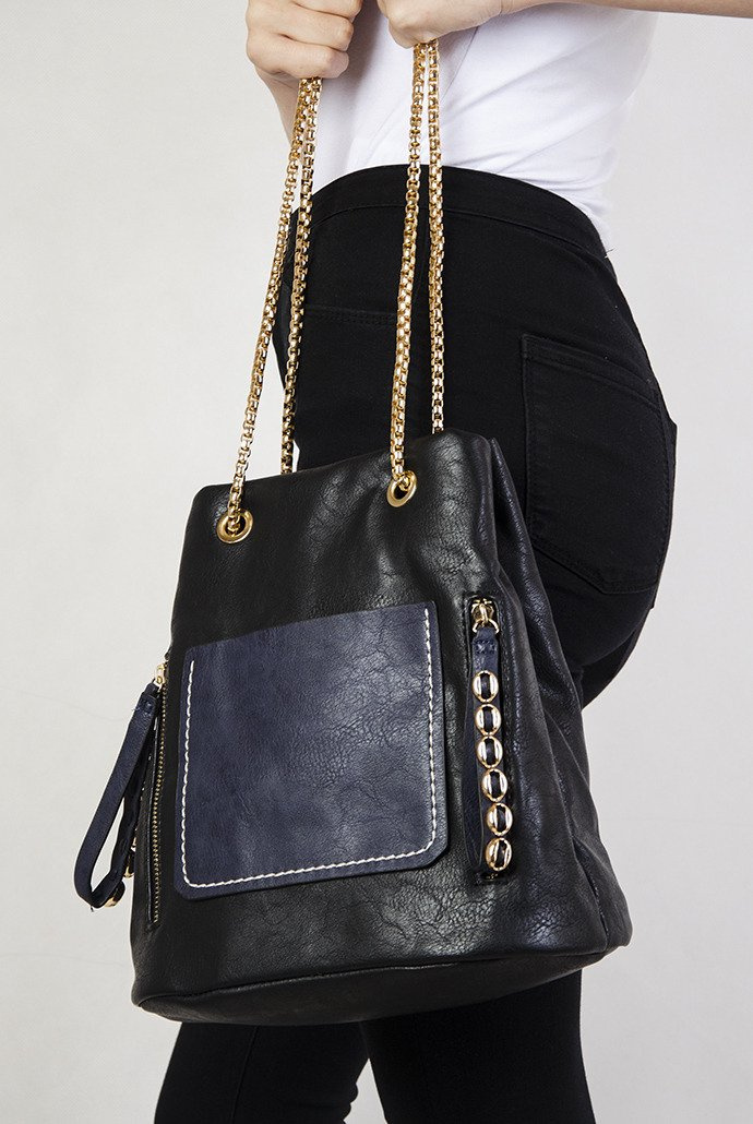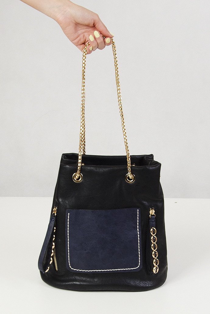 Czarno-granatowa torebka na złotym łańcuszku.