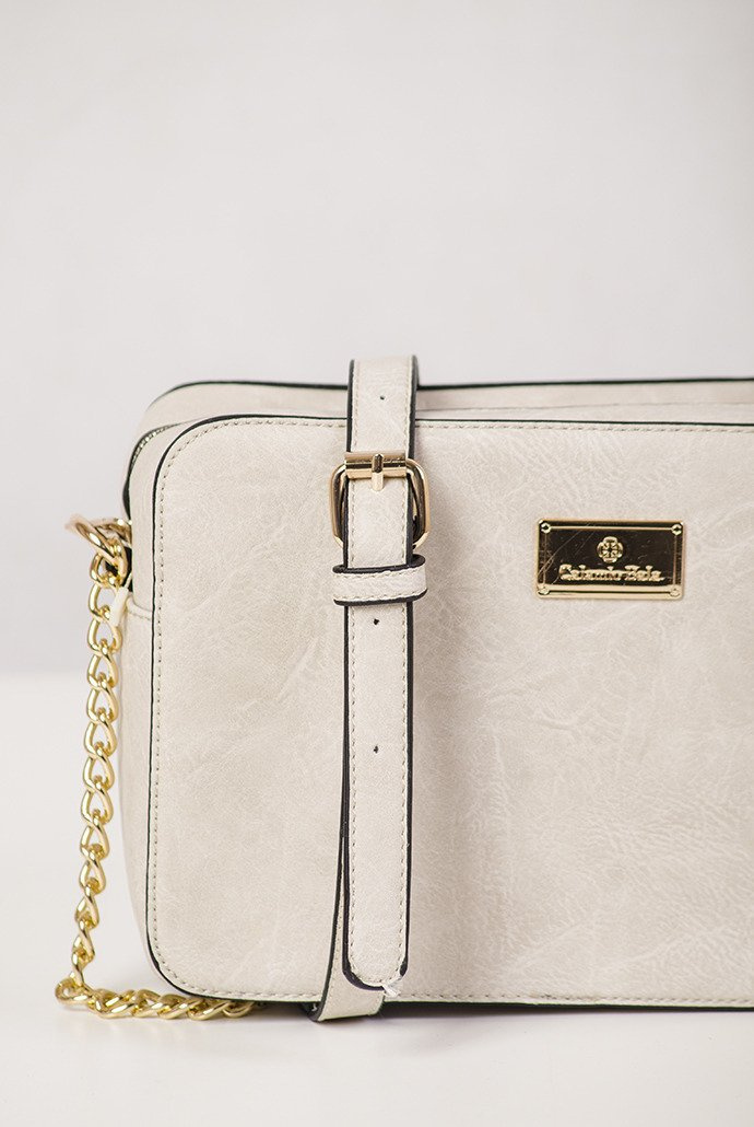 Beżowa, usztywniana torebka ze złotym łańcuszkiem, którego długość można regulować. W środku liczne przegródki na klucze czy portfel.