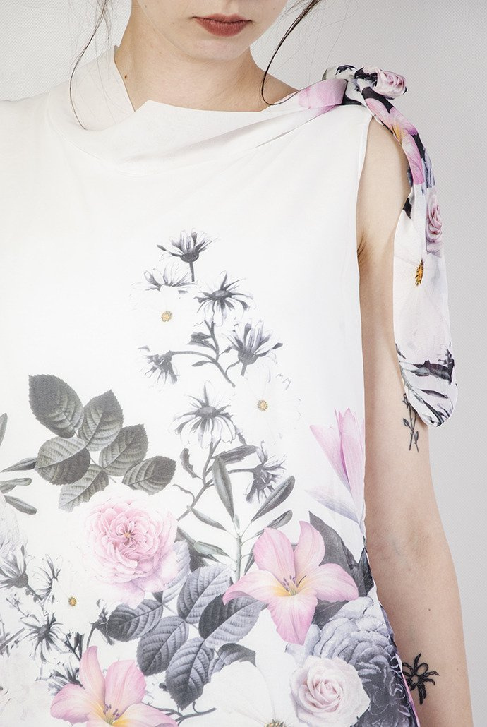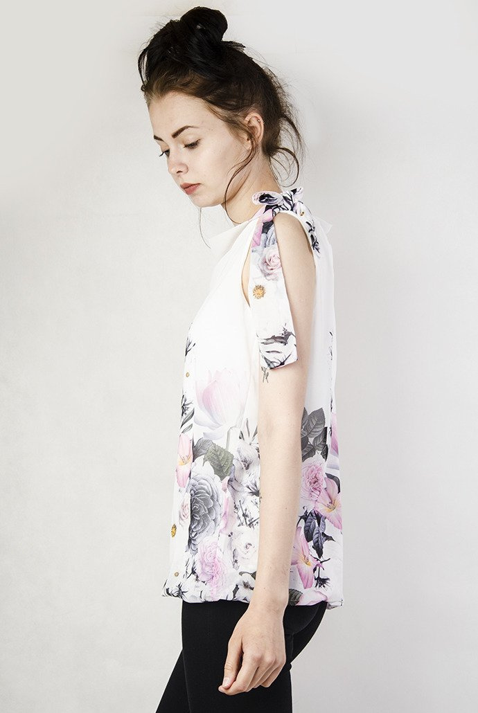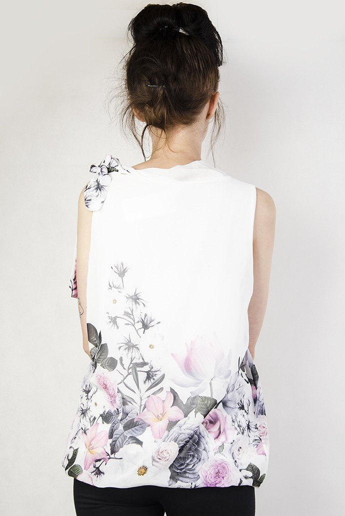 Biała, zwiewna bluzka z wiązaniem przy ramieniu, w kwiaty.
