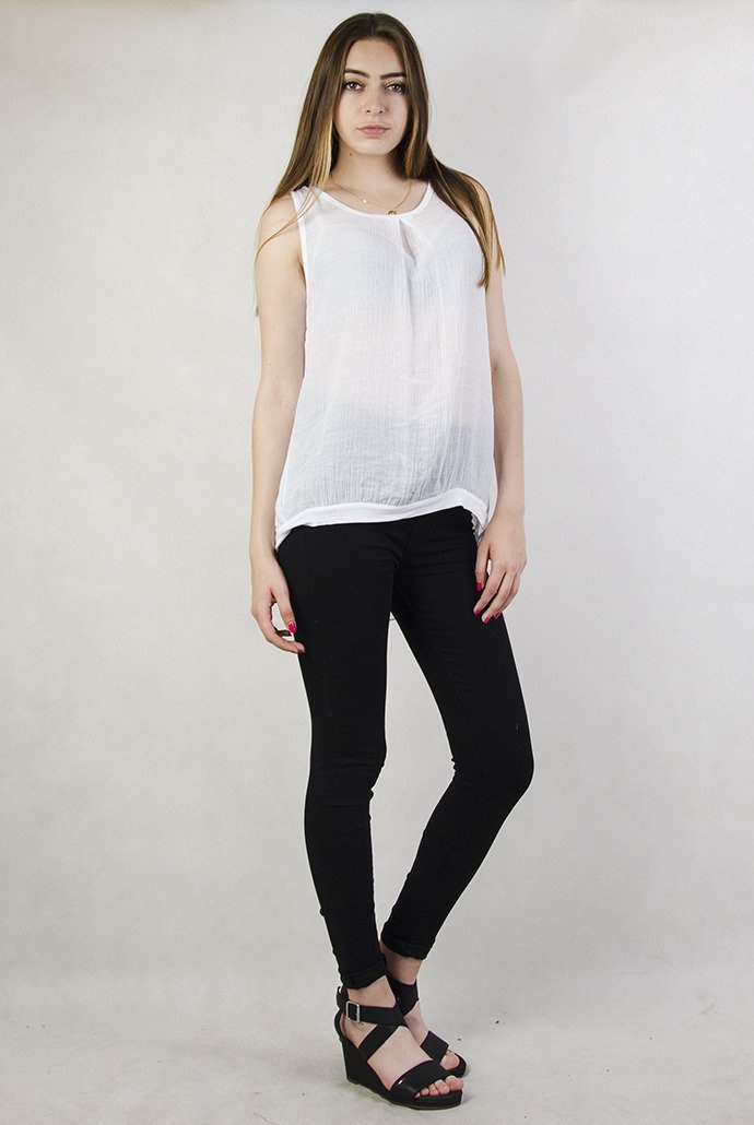 Biała bluzka z przedłużanym oraz łączonym tyłem z trzema guzikami.