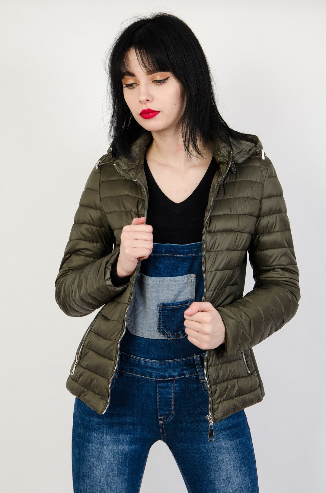 Zielona, pikowana kurtka z kapturem. Posiada wstawkę z materiału przy boku.
