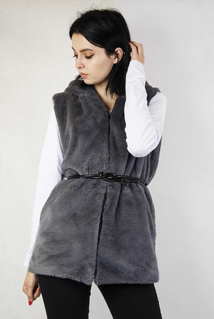 Szara futerkowa kamizelka z rzemykiem w pasie
