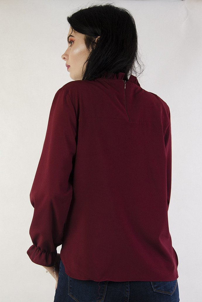 Bordowa bluzka z falbanką przy szyi i rękawach.