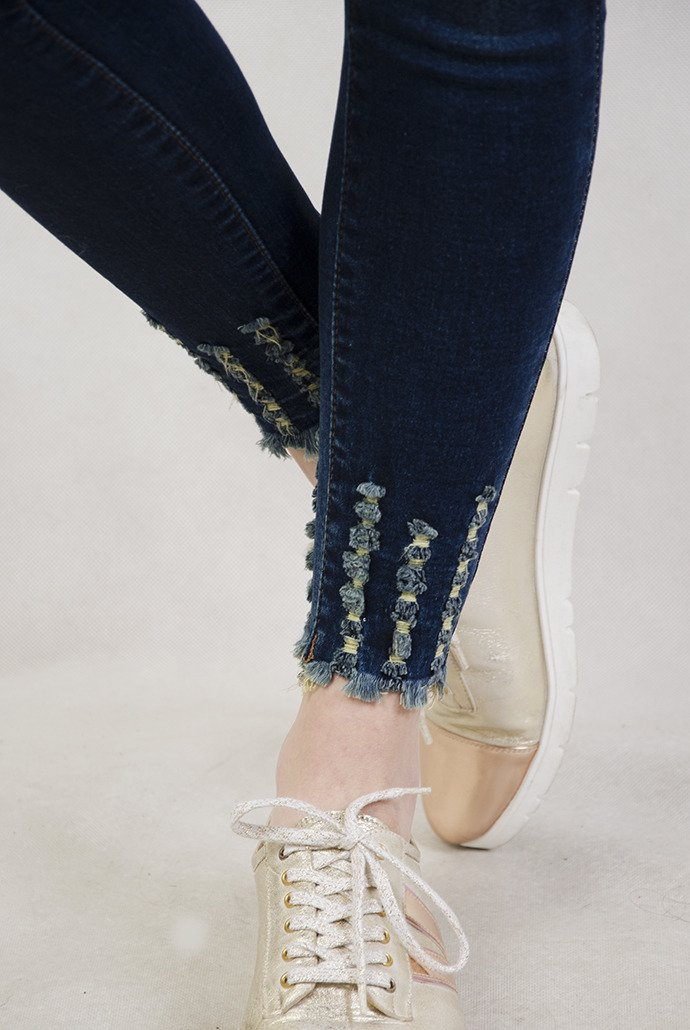 Ciemne spodnie jeansowe z wysokim stanem oraz szarpaniami przy nogawce.