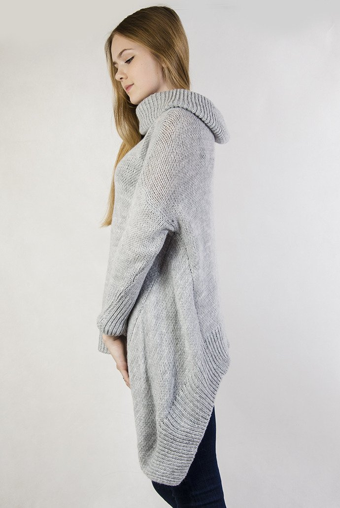 Szary sweter z luźnym golfem oraz przedłużanymi bokami.