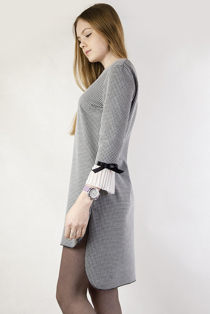 Asymetryczna sukienka w pepitkę z plisowaniem przy rękawie.