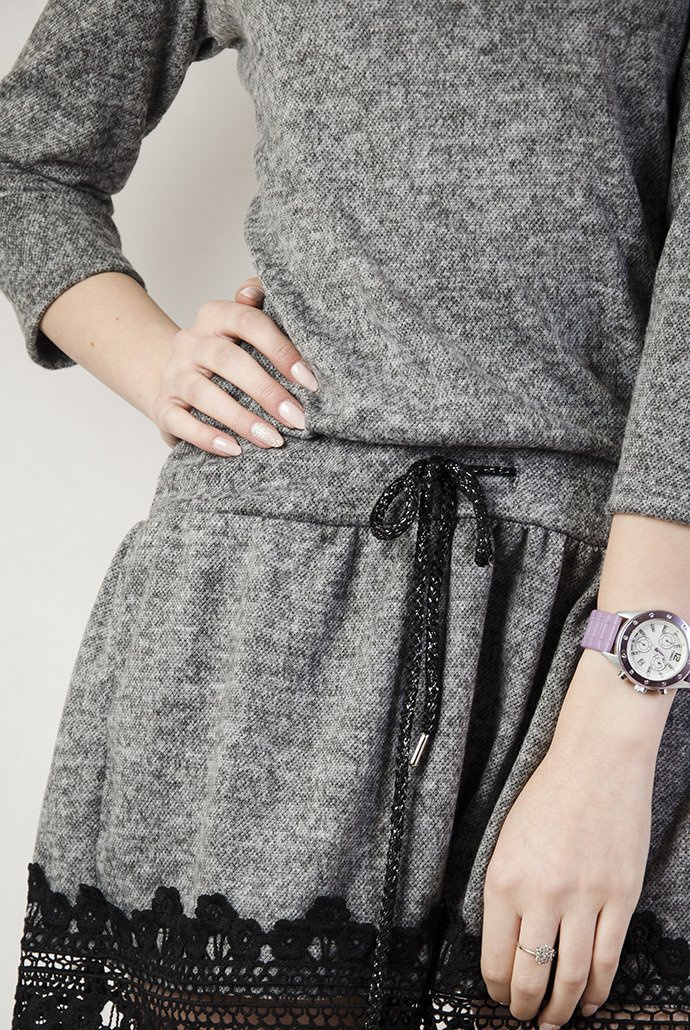 Ciemnoszara sukienka z wiązaniem w pasie oraz koronka na rękawach