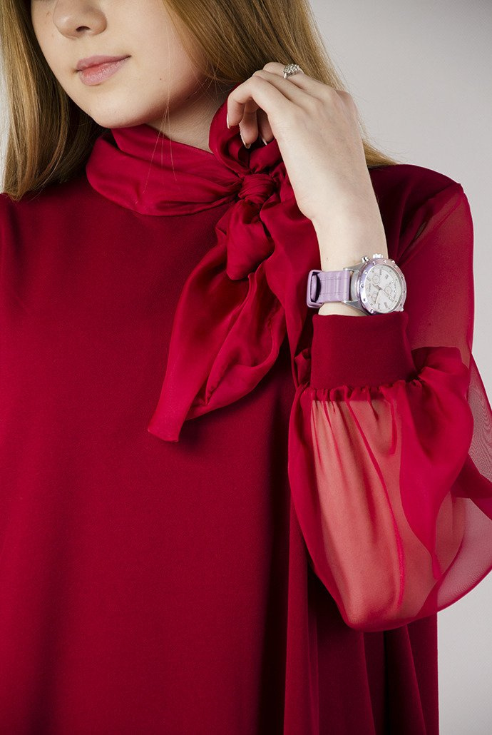 Zwiewna bordowa sukienka z rękawami z tiulu