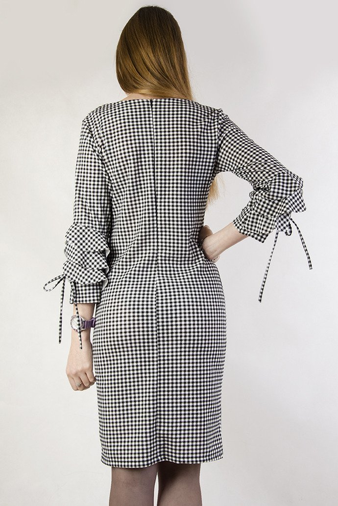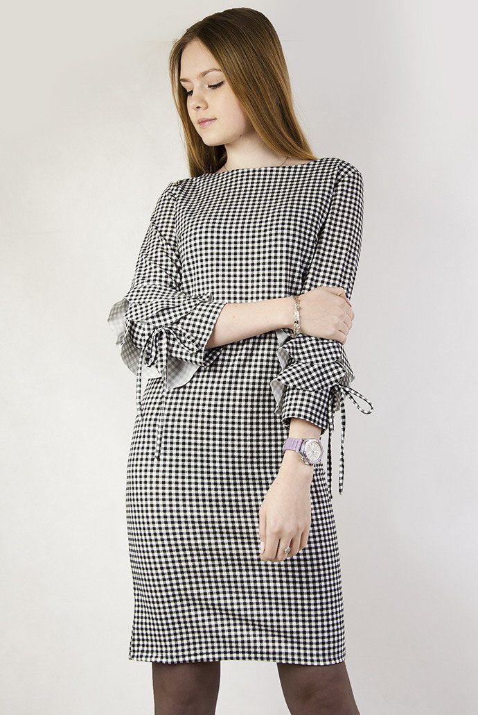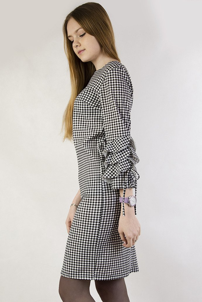 Sukienka w czarno-białą kratkę z falbanami przy rękawach