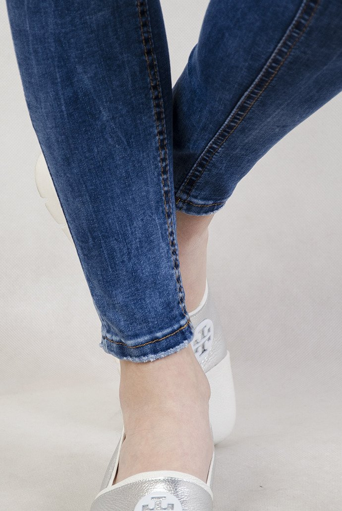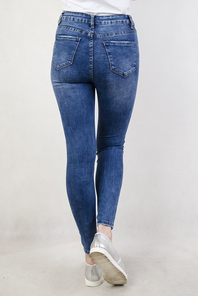 Jasne spodnie jeansowe z przetarciami oraz wysokim stanem
