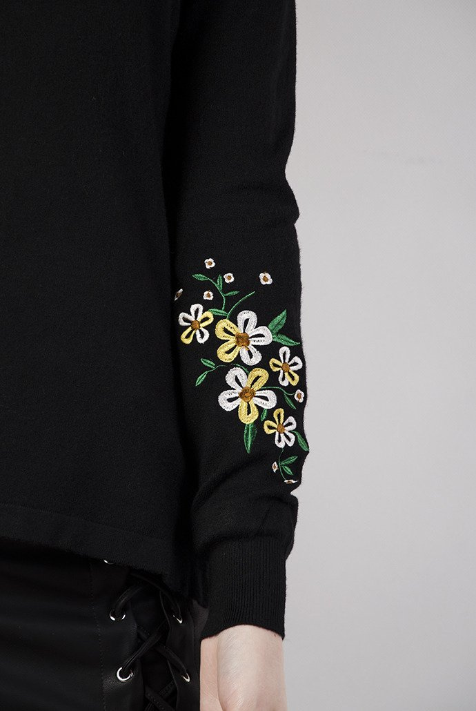 Czarny sweterek z kwiatami haftowanymi na rękawach