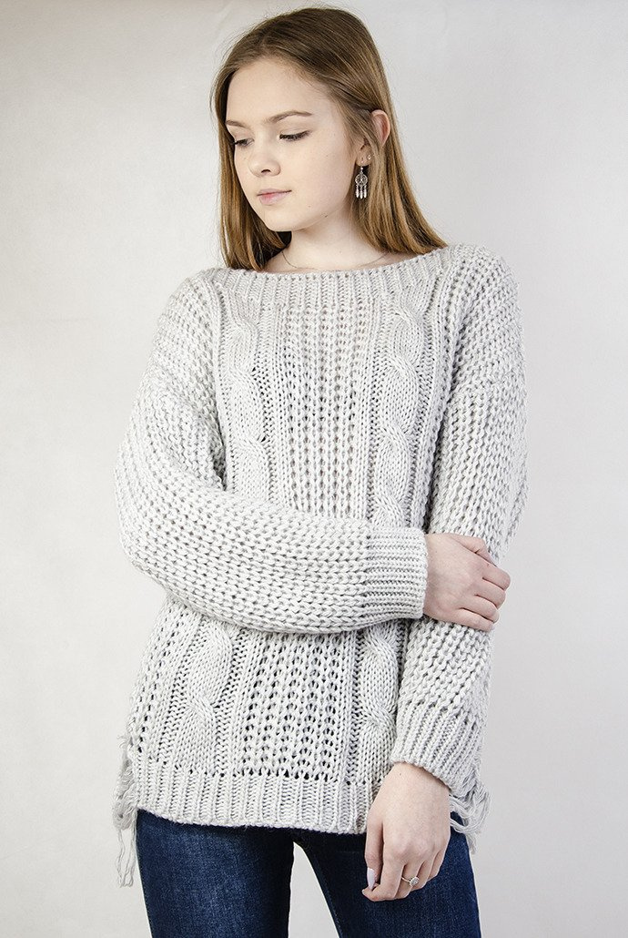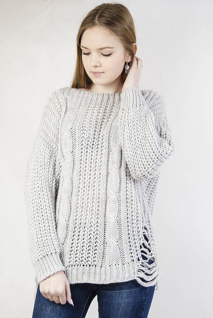 Szary sweter z szarpaniami po bokach