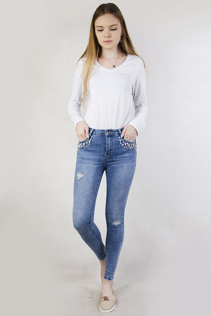 Jasne spodnie z koralikami przy kieszeni