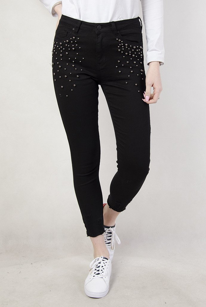 Czarne spodnie jeansowe z koralikami i przetarciami