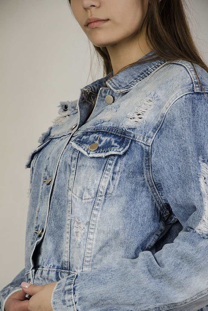 Kurtka jeansowa krótka z przetarciami oraz szarpaniami