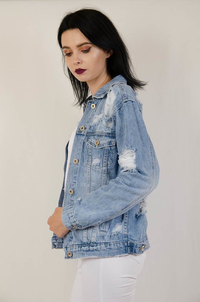 Kurtka jeansowa w jaśniejszym odcieniu jeansu, z licznymi przetarciami.