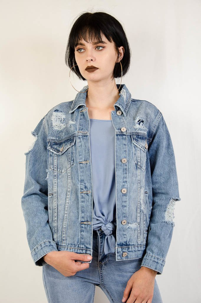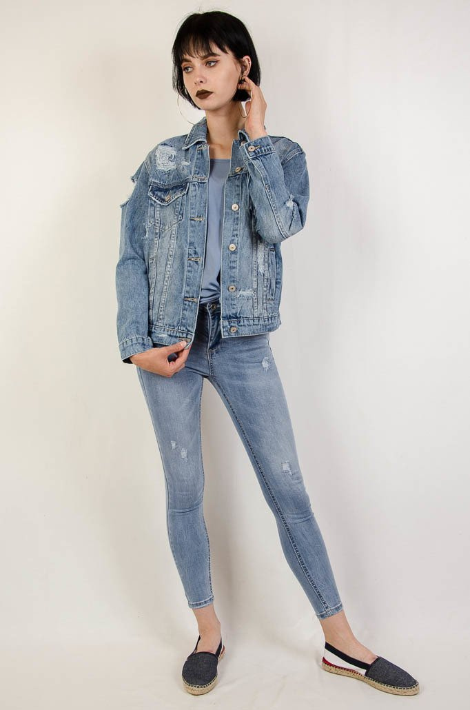 Kurtka jeansowa zapinana na guziki, z przetarciami.