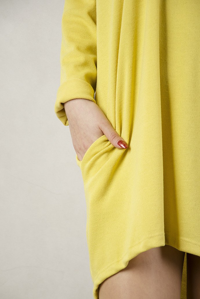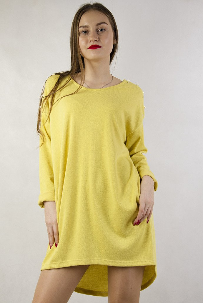 Żółta asymetryczna tunika z perełkami oraz wycięciem na plecach. Dla osób niższych sprawdzi się jako sukienka.