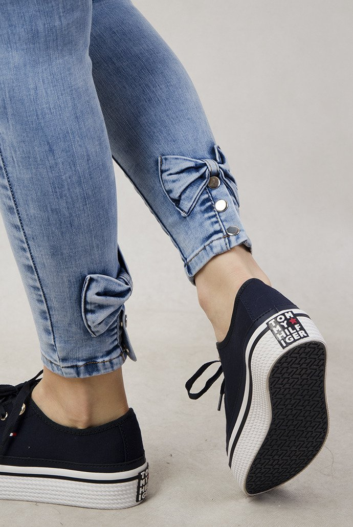 Jasne spodnie jeansowe z kokardami przy nogawce