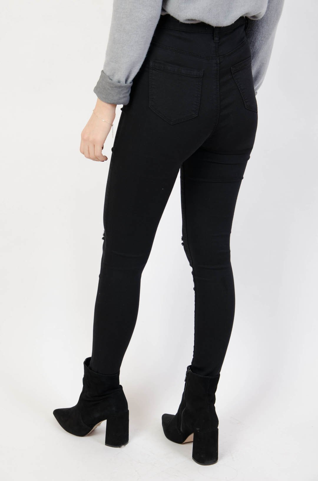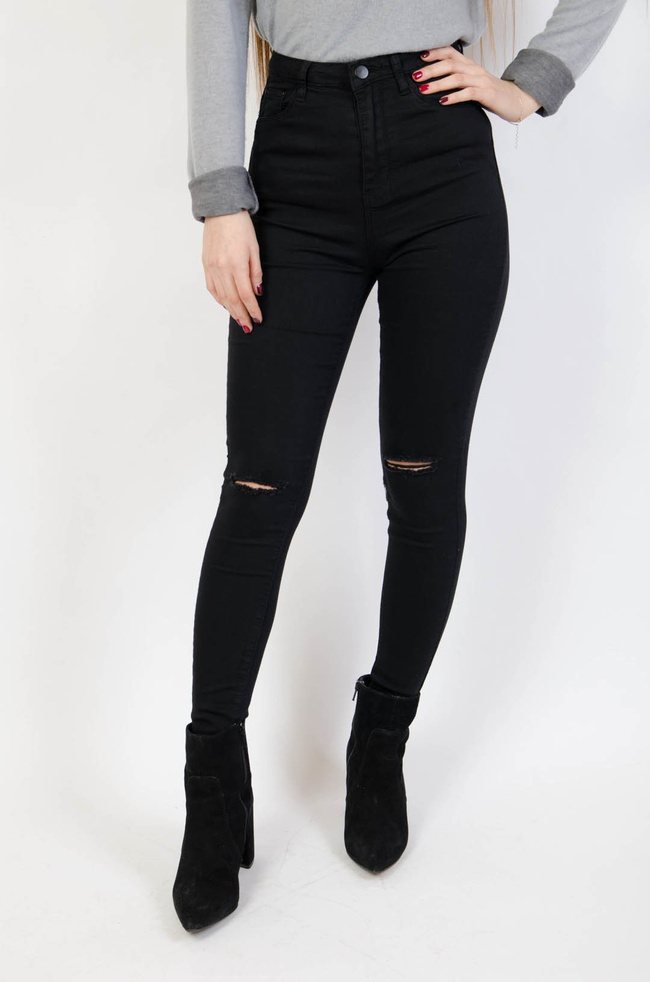 Czarne spodnie z wysokim stanem oraz rozcięciami na kolanach