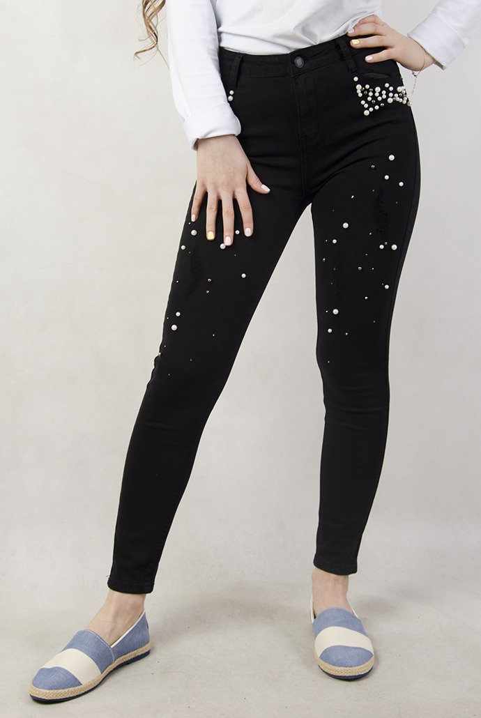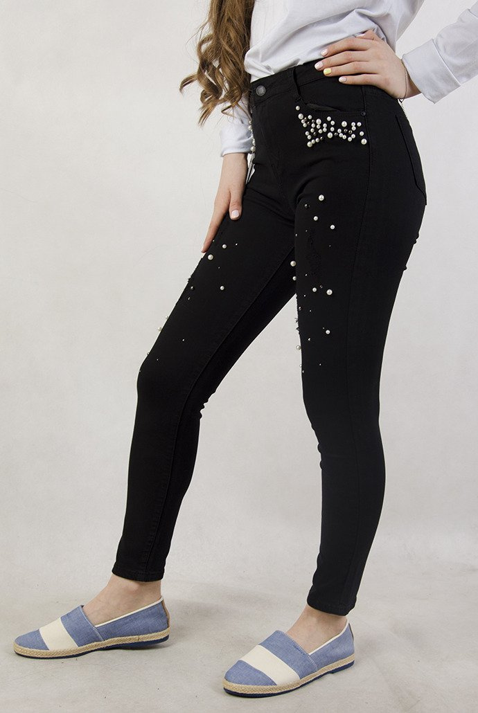 Czarne spodnie z przetarciami oraz koralikami