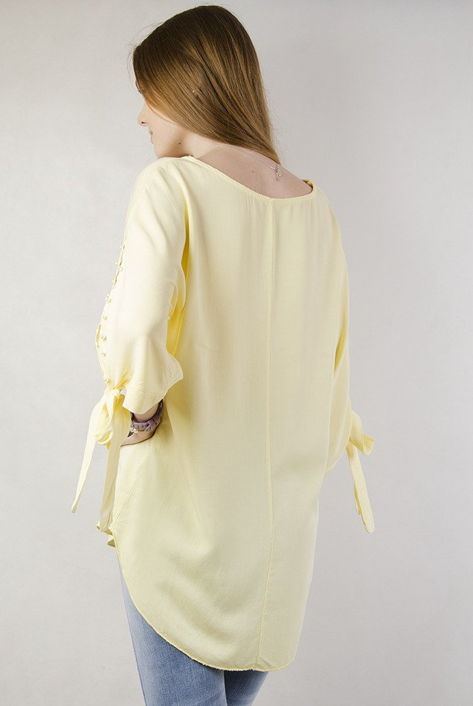 Żółta asymetryczna bluzka z wiązaniem przy rękawie oraz perełkami