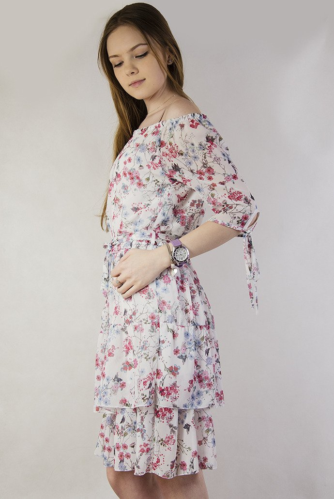 Biała sukienka w kwiaty z wiązaniem w pasie