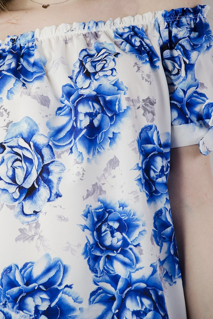 Biała bluzka hiszpanka w niebieskie kwiaty