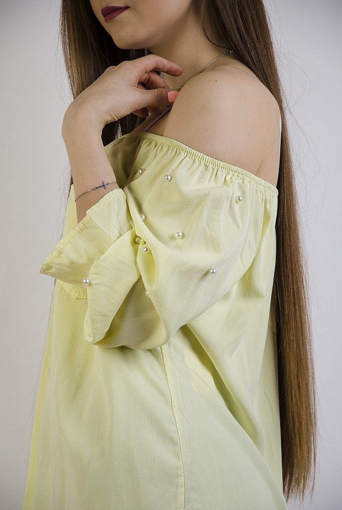 Żółta bluzka z hiszpańskim dekoltem i koralikami
