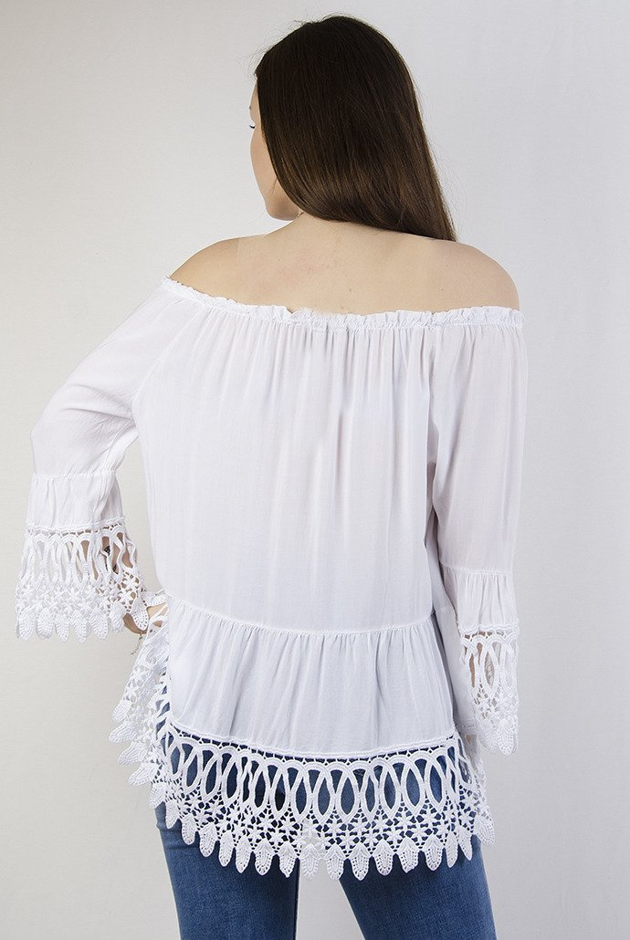 Biała bluzka z hiszpańskim dekoltem i ażurowymi wstawkami