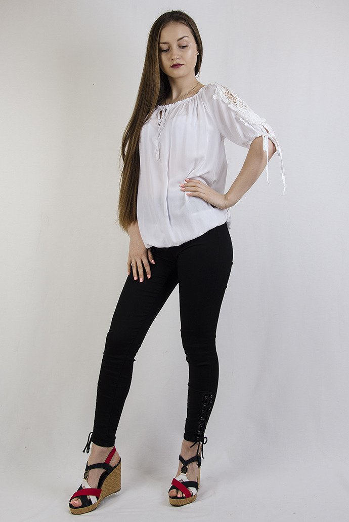 Biała bluzka z gumką na dole i ażurowymi wstawkami