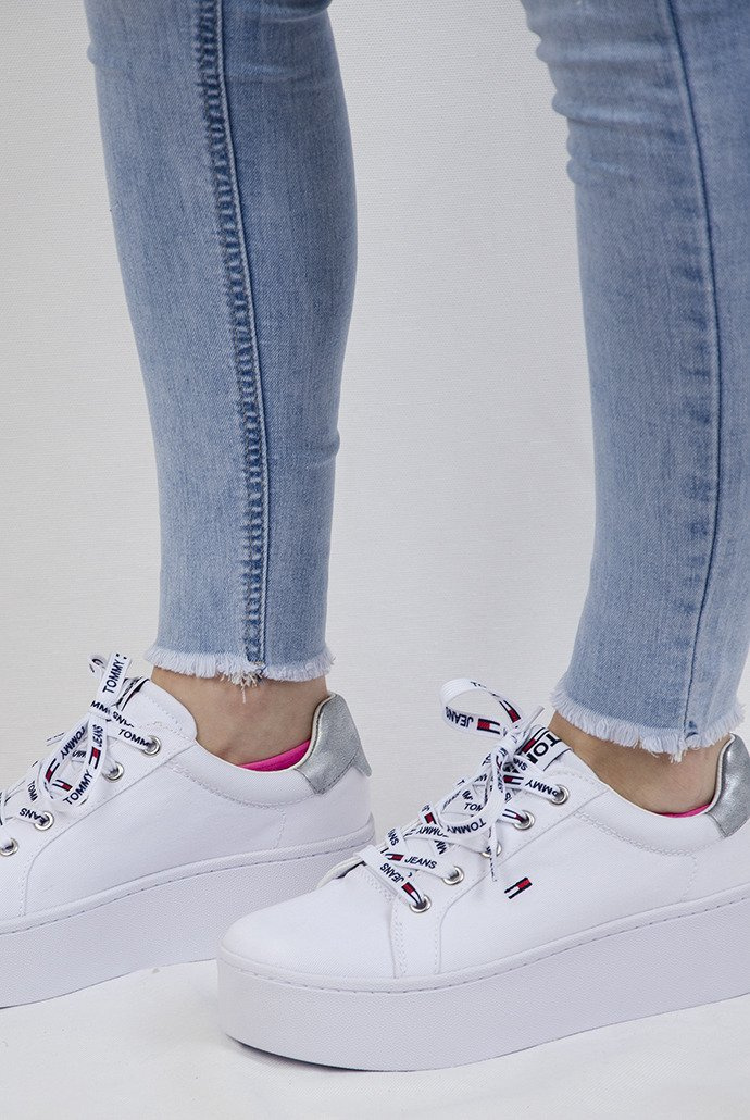 Jasne spodnie z białą gumą przy pasie