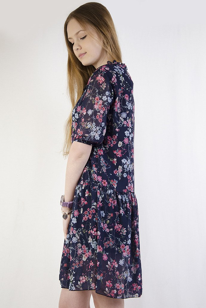 Zwiewna granatowa sukienka w kwiaty z wiązaniem przy szyi