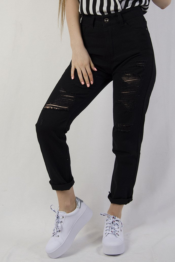 Czarne spodnie boyfriend z szarpaniami przy nogawce