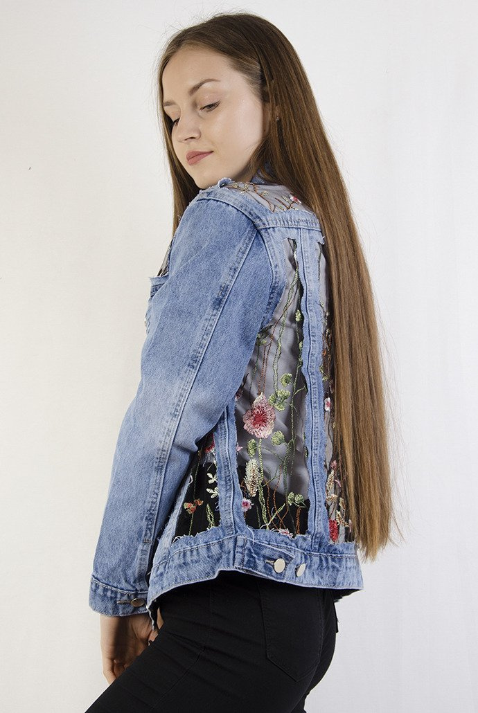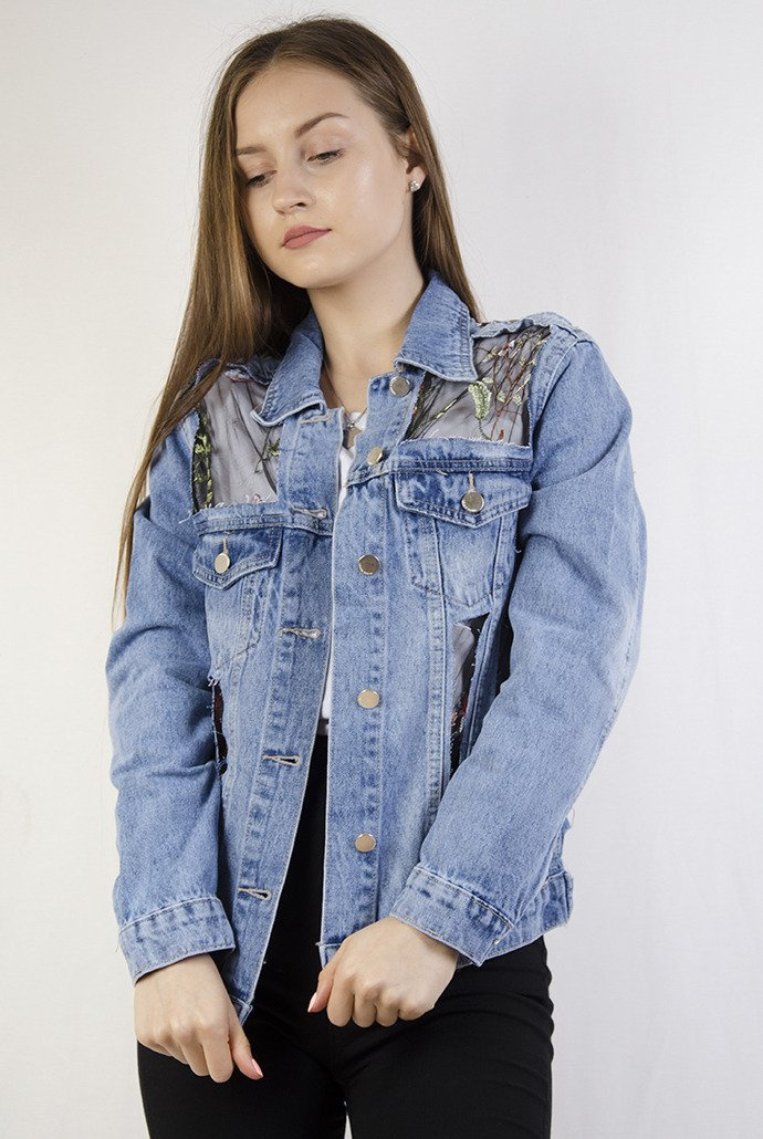 Kurtka jeansowa z haftami i elementami prześwitującymi